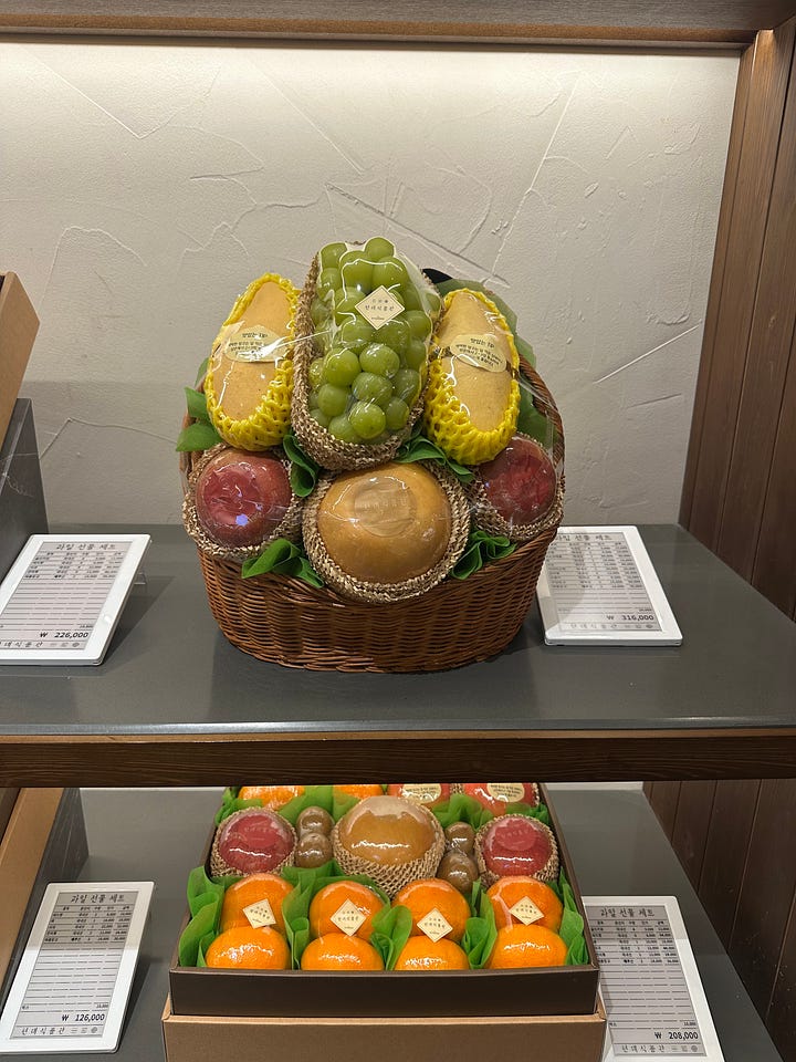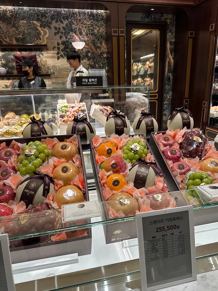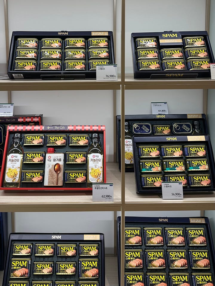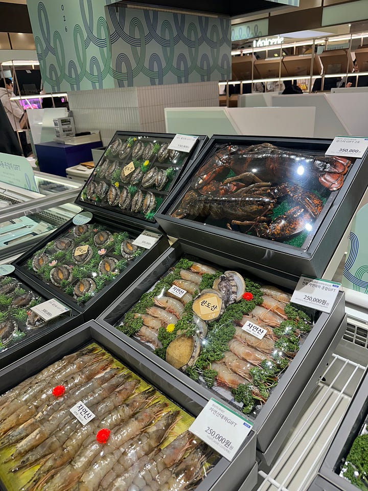 Gift culture in Korea is striking in its practicality, a logic that becomes clearer when you begin with how items like Spam entered Korean kitchens after the Korean War before expanding into today’s premium fruit and seafood gift sets. Alongside beautifully boxed fruit—perfectly graded apples or pears that signal care, seasonality, and status—you’ll find meticulously packaged Spam sets and premium seafood gift boxes stacked for holidays like Chuseok (the autumn harvest festival) and Seollal (Lunar New Year), which was about a week away when I was there. High-end department stores prominently display sets of dried yellow corvina, abalone, premium tuna, or carefully portioned beef and fish, arranged in lacquered or insulated boxes. Seafood gifting is tied to status and seasonality: it signals abundance, freshness, and the ability to offer something both luxurious and immediately useful for family gatherings.