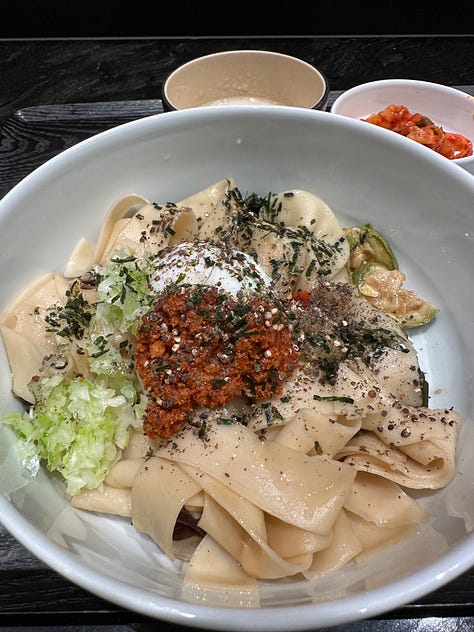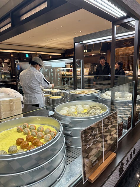 The food halls were the real event for me. I spent several lunches there and always found something new. Noodle stations pulling hand-cut strands to order. Sushi boats offering otoro with truffle, sea urchin wrapped in gamtae, an edible seaweed that has been gaining attention in Korean kitchens for its softer texture and oceanic flavour, and which chefs are increasingly featuring on menus both in Korea and abroad. Temporary pop-ups selling unusual hybrids: sweet rose pasta at one stall, Korean-style corn dogs at another. Italian beside Korean beside Singaporean beside something vaguely Californian. The stalls were immaculately clean, even with open kitchens, and their products beautifully presented. I often did a couple of laps before deciding what to eat, grateful to be alone and not inflicting my decision paralysis on anyone else.