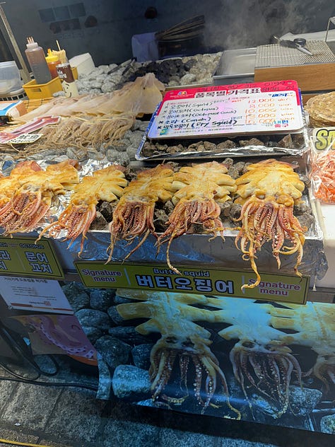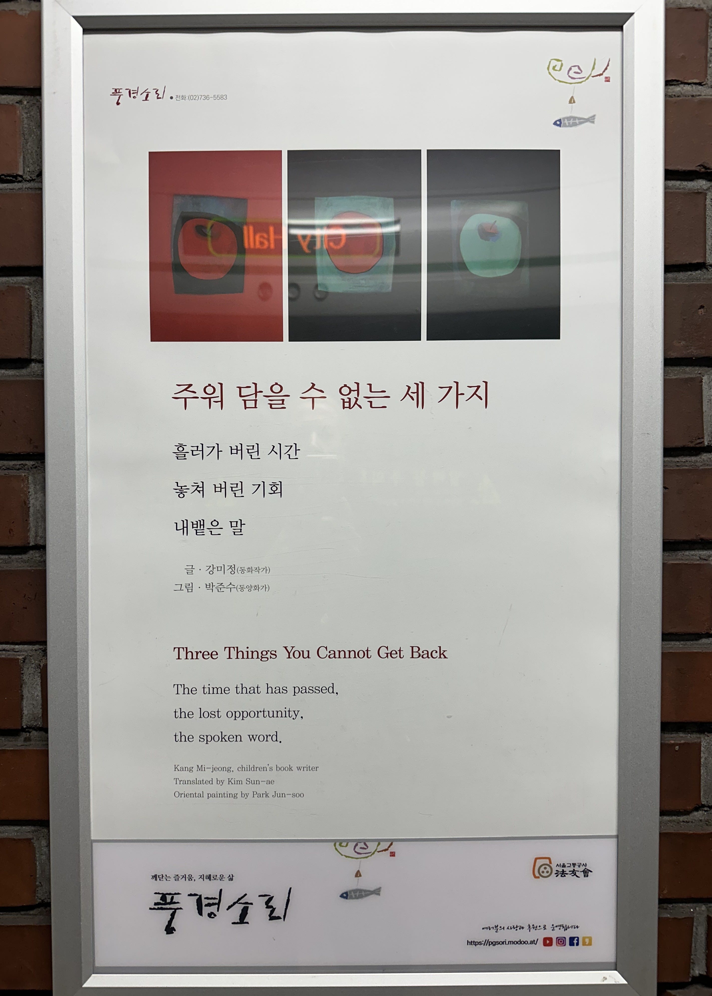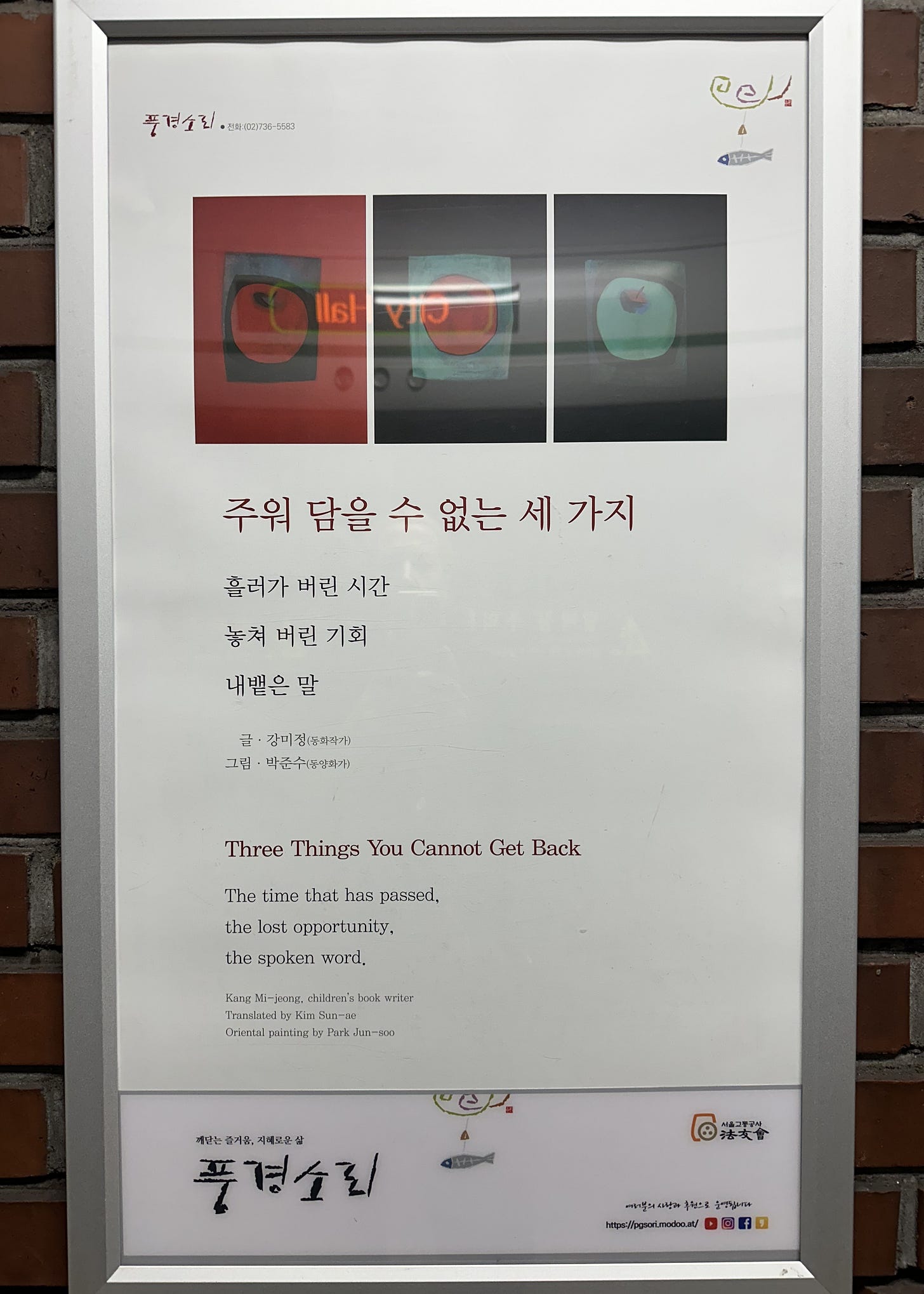Despite the inconveniences, jet lag, travel delays, language barriers that made an ATM nearly impossible without Google Lens, and one regrettable oyster, travel for me is always worth it. Somewhere between transfers, I noticed a subway poster quoting children’s author Kang Mi-Jeong: “Three things you cannot get back: the time that has passed, the lost opportunity, the spoken word.” Wisdom in the subway. A reminder, perhaps, not to waste days or words.