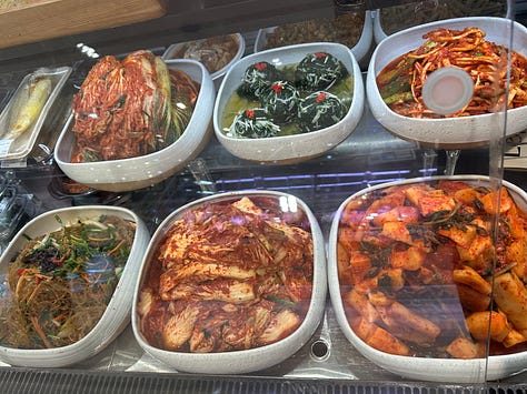 I’ve always liked Korean food, having had my fair share of it living in Vancouver, being particularly fond of banchan, the fermented side dishes that accompany everything else. In Seoul I ate well and often: bibimbap (mixed rice bowl), kimbap (seaweed-wrapped rice rolls with various fillings), bulgogi (marinated beef), pajeon (savoury scallion pancake), sundubu jjigae (soft tofu stew), hobakjuk (pumpkin soup), kalguksu (knife-cut noodles), seaweed in soup, snack, and fermented varieties, wang mandu (steamed king-sized dumplings), and yubu chobap (seasoned rice and various fillings stuffed into sweet tofu pockets). I was happy to find steamed greens each morning at breakfast, kimchi with nearly every meal, and quick bites from market stalls or between subway stops.