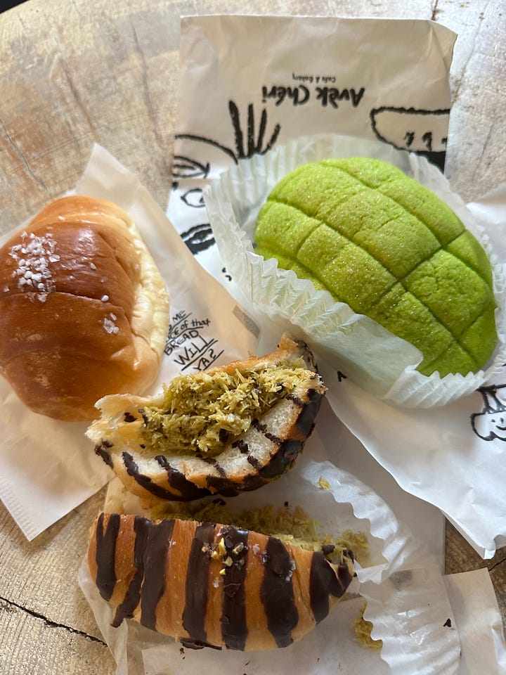 I was directed toward their salt bread, and it was soft, buttery, properly salted. Originally from Japan, it has been widely adopted in Korea, where bakeries tend to enrich it further. One version I tried was filled with Dubai chocolate, a pistachio-based confection that is very much on trend, wrapped in a soft, salty bun. The server suggested the melon bread as well. It carried a clear green melon note and, despite its appearance, wasn’t soda sweet. I can manage only a few bites of something sugar saturated before it becomes too much and this stayed well below that threshold.